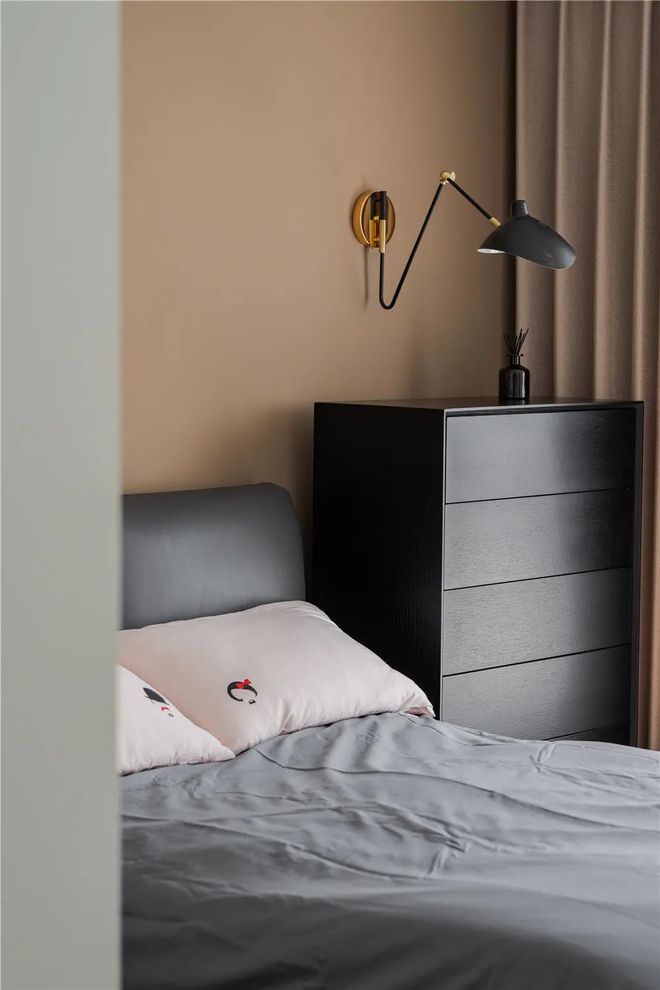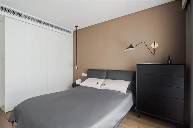 主卧是屋主夫妻的房间,背景墙涂刷了米驼色的乳胶漆,色彩温馨舒缓,让人一进到整个房间就觉得很放松。