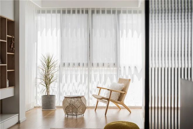 阳台安装了白色的薄纱窗帘,质感轻盈通透,可以过滤刺眼的自然光,让照进屋内的光线变得更加柔和