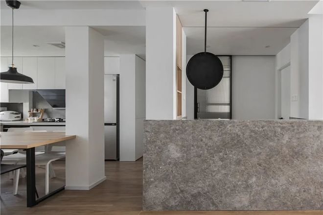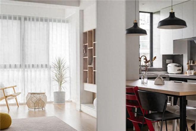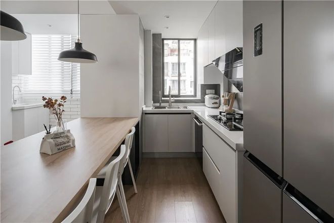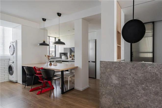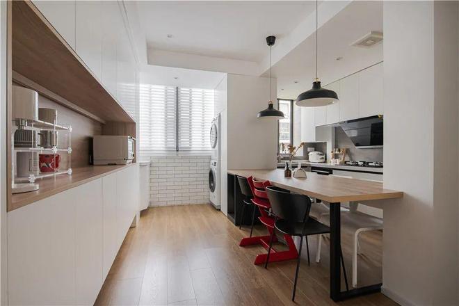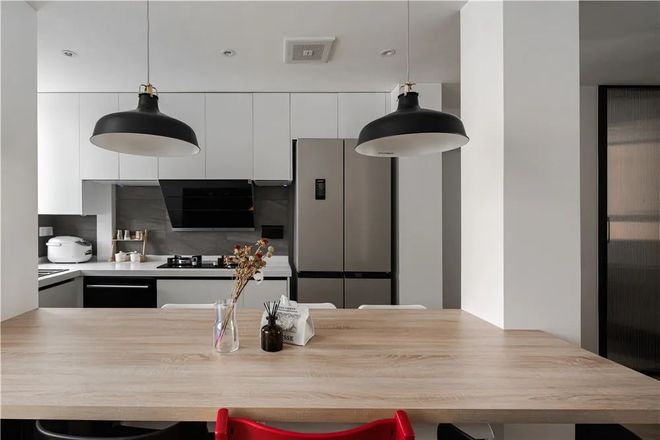 ②打通厨房和餐厅,用餐桌代替隔墙,既增加了两个空间的交互性,也让室内呈现出通透明亮的效果。