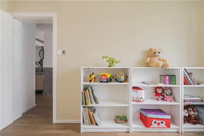 次卧被改造成了儿童房,墙面刷了木色的乳胶漆,效果简约温馨。室内没有做过多的装饰,除了必要的床和衣柜外,设计师还增设了一个玩具柜,用来收纳孩子的玩具和绘本。