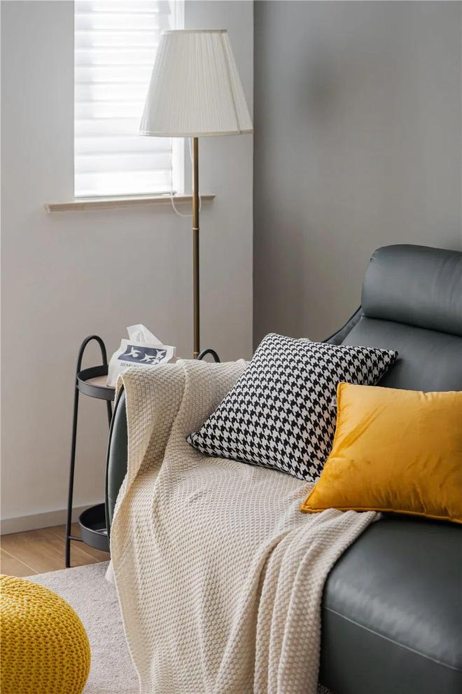 一字型灰色皮质沙发靠墙摆放,坐感很舒适;旁边放了一盏落地灯,营造出温馨舒适的休闲氛围。