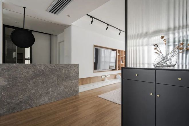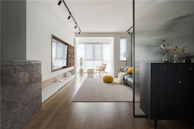 为了解决这个缺陷,设计师借助一部分客厅面积,在入户门的右侧安装了长虹玻璃隔断,可以遮挡入户视线,