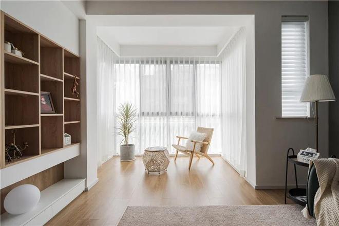设计师在阳台内布置了竹木靠椅、镂空茶几、大型盆栽等,构筑出安静美好的生活画面,让屋主在家里就能享受“诗与远方”。