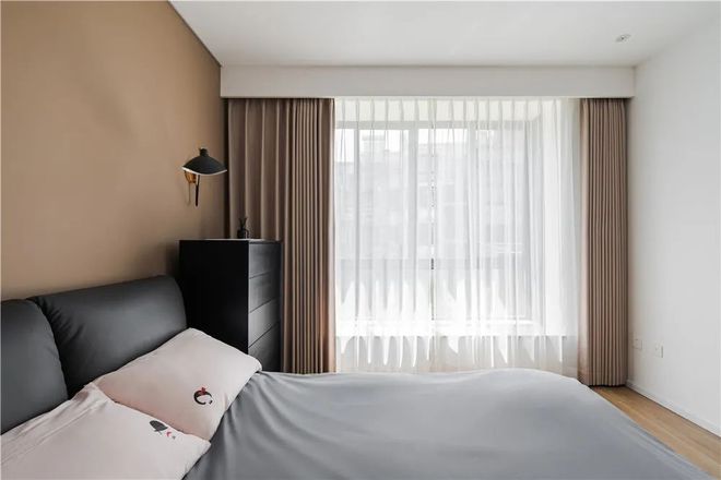 窗帘是双层设计,一层米驼色丝绒窗帘,和卧室背景墙相呼应,有很好的遮光性;另一层则是白纱帘,透光不透物,屋主可以根据需求随意切换。