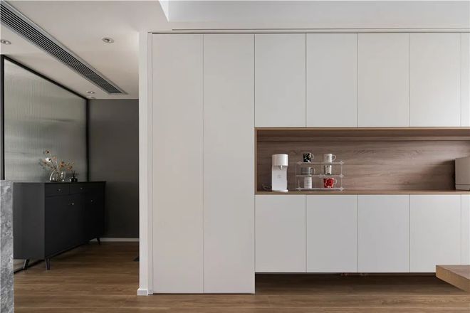 顶天立地的餐边柜,让餐厨区拥有了丰富的储物空间;柜子中间留出一排开放式柜格,柜板后预留了插座,充当了水吧的功能,咖啡机、榨汁机等小厨电都能即插即用。