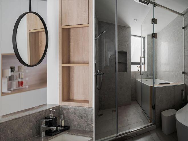 原卫生间的面积很小,做不了干湿分区。为了解决这个问题,设计师把洗手台移到了走廊的位置,也就是玄关的正对面;定制半高大理石台盆和悬挂式圆镜,效果美观又高级。