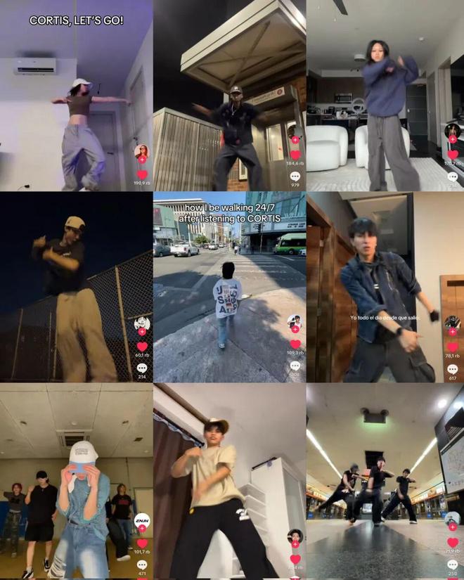 因此,歌曲越来越短、重复性越来越强的洗脑旋律与歌词、简单易上手的编舞也逐渐成为流行。比如在发行一个月后,CORTIS的先行曲《GO!》仍然在TiikTok爆红的舞蹈Challenge便是如此。在GO,GO,GO的节奏驱使下,该舞蹈动作也被拆解为适配各类场景的抽象表达。