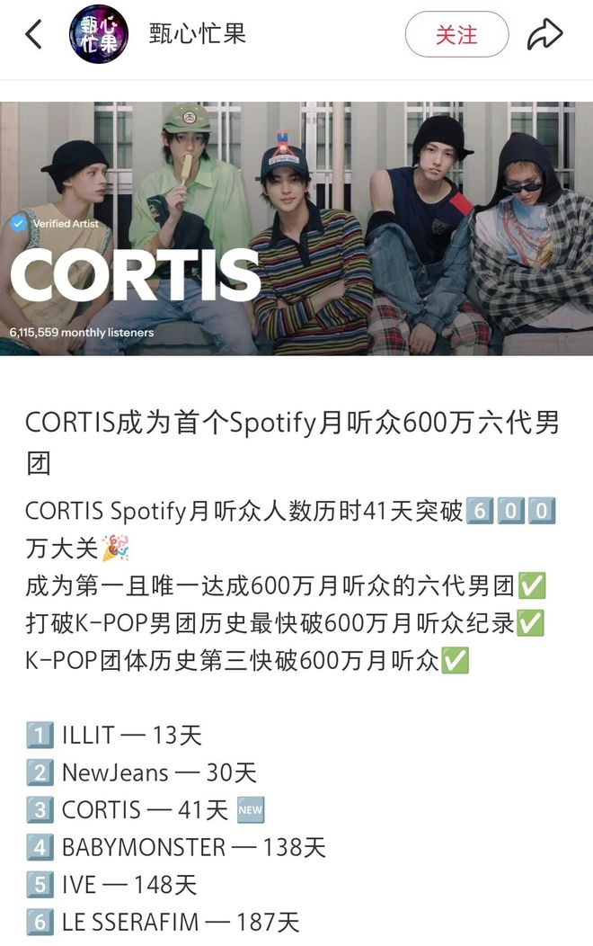 根据Hanteo榜单数据,在过去的9月,CORTIS也多次拿下世界地区综合榜中日本、中国分区第一。事实上,相比其他市场的活跃,比较罕见的则是这组新人能够在韩流式微的内地市场得以破圈。比如CORTIS出道二十天,便在内地抖音平台关注粉丝量超过100万,如今已超过250万,涨粉速度远超深度耕耘内地多年的SEVETEEN、TXT等当红头部男团。
